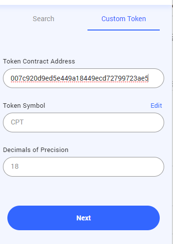 After selecting 'Custom Token' menu, When you enter the ChartpanToken contract into the token contract address, the symbol and digits are automatically entered.